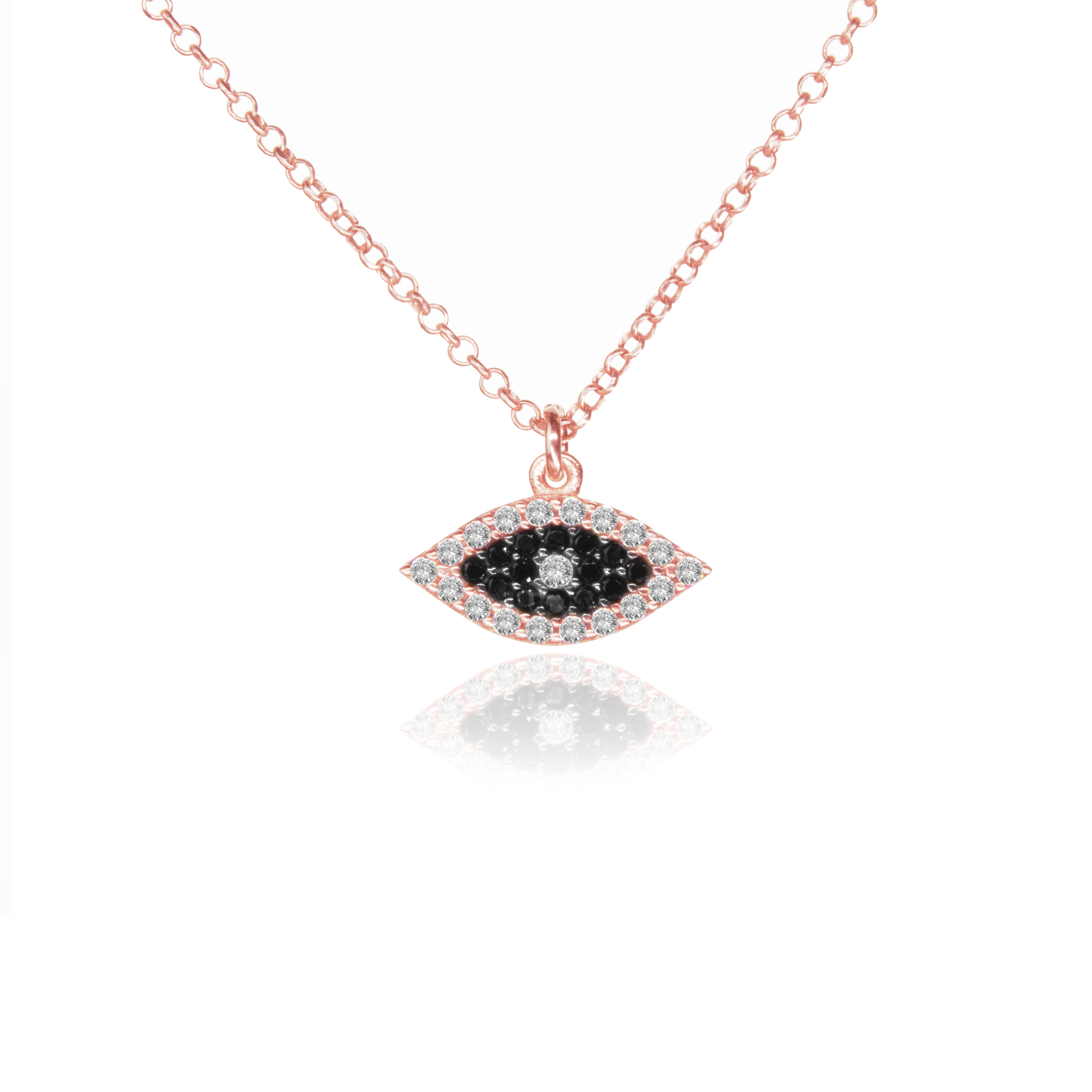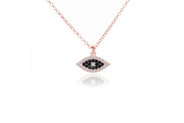Evil Eye necklace made of rose plated sterling silver 925, decorated with white and black cubic zirconia.