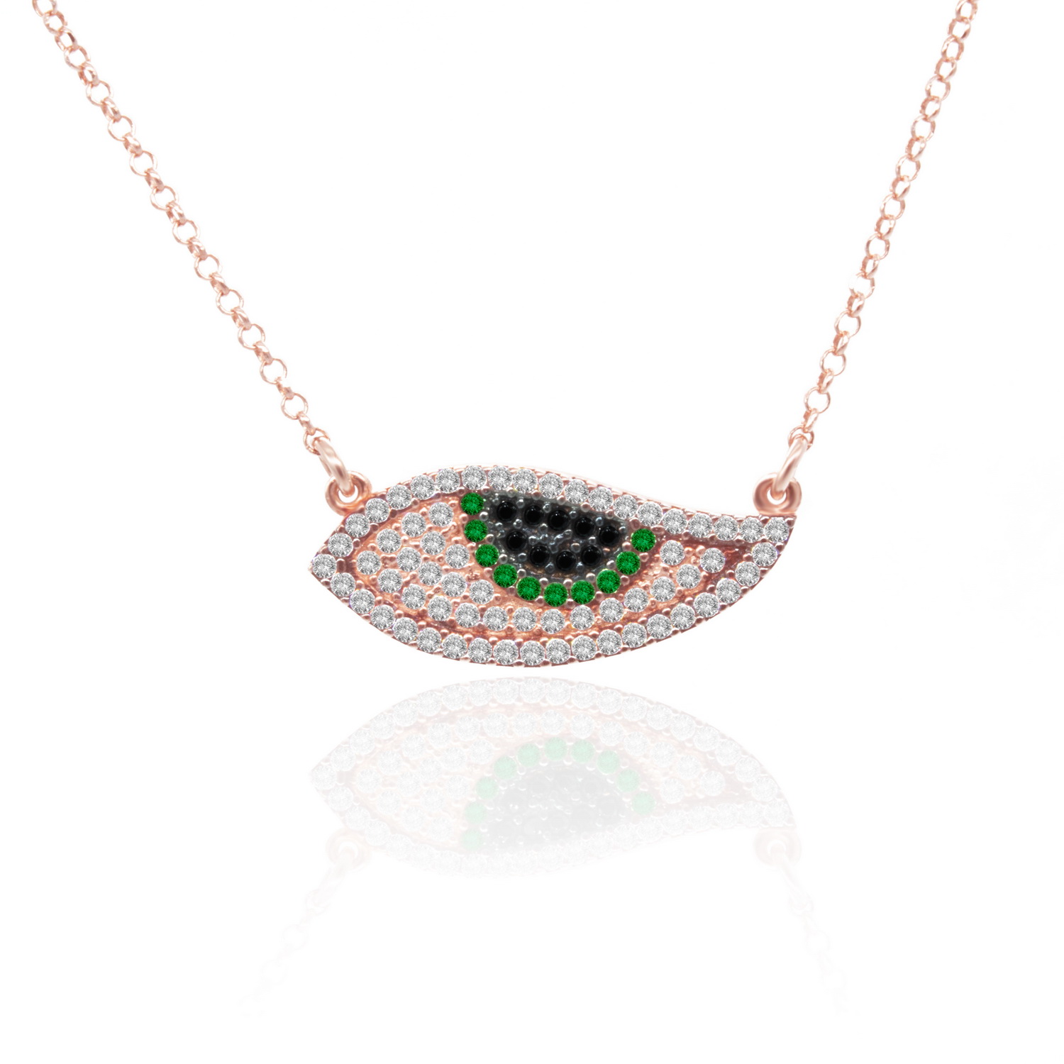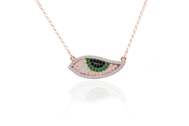 Evil Eye necklace made of rose plated sterling silver 925, decorated with white,green and black cubic zirconia.