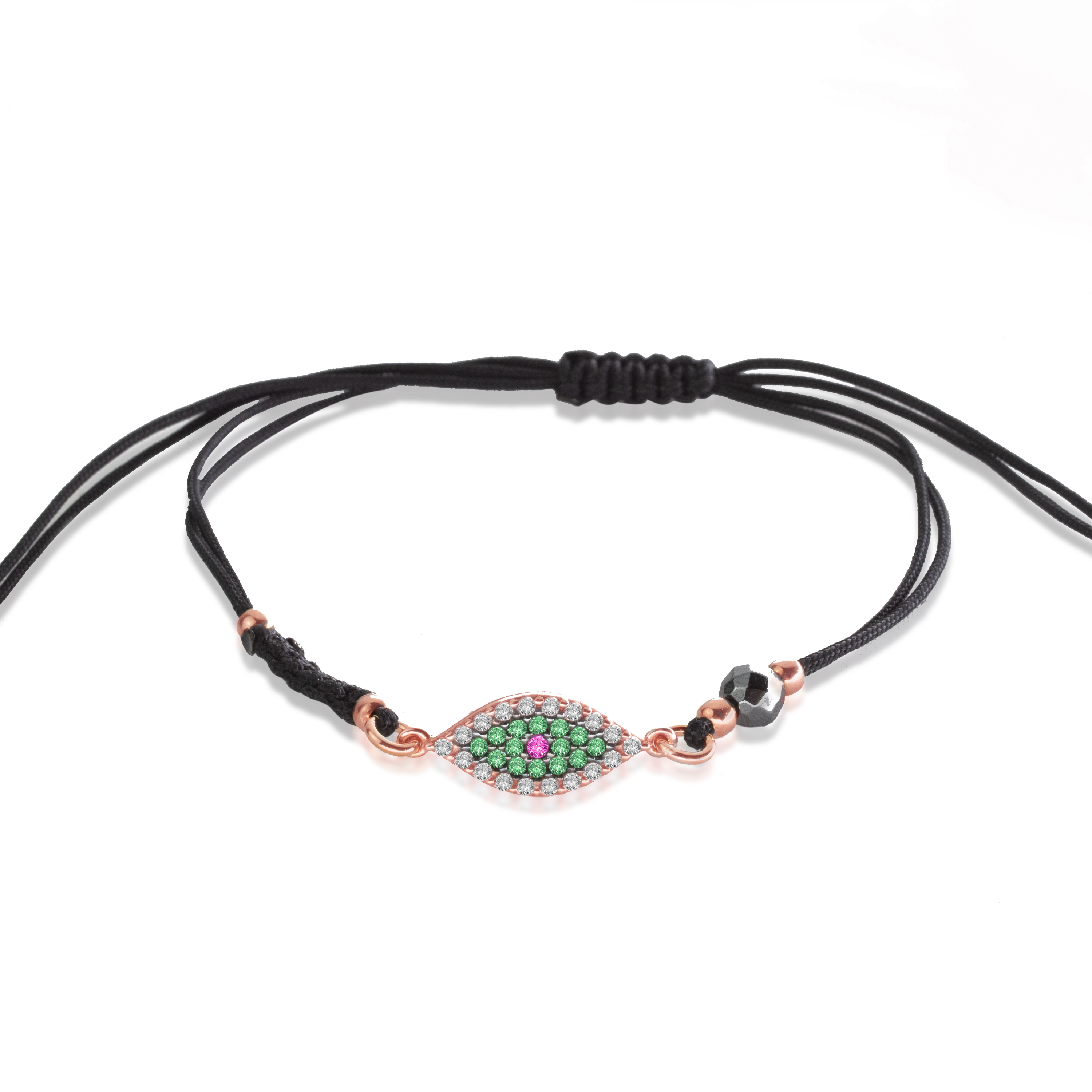 Evil Eye bracelet with black coloured cord made of rose plated sterling silver 925, decorated with white, green and red cubic zirconia.
