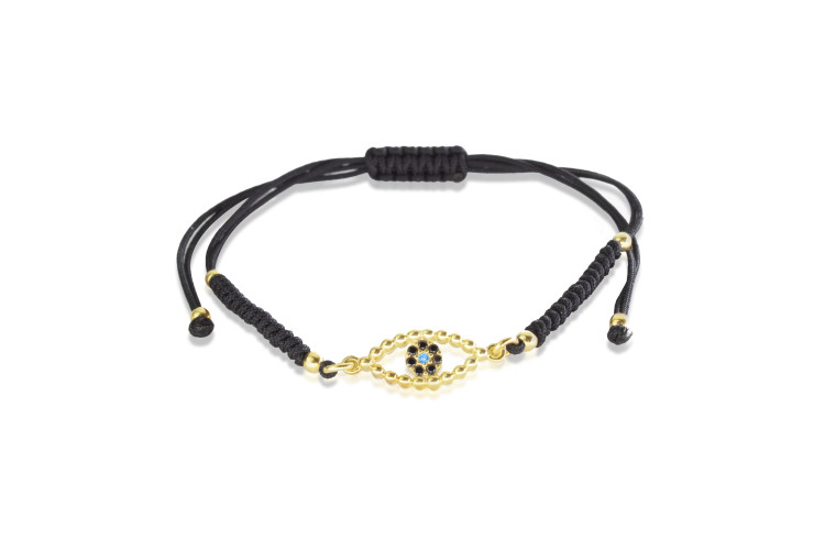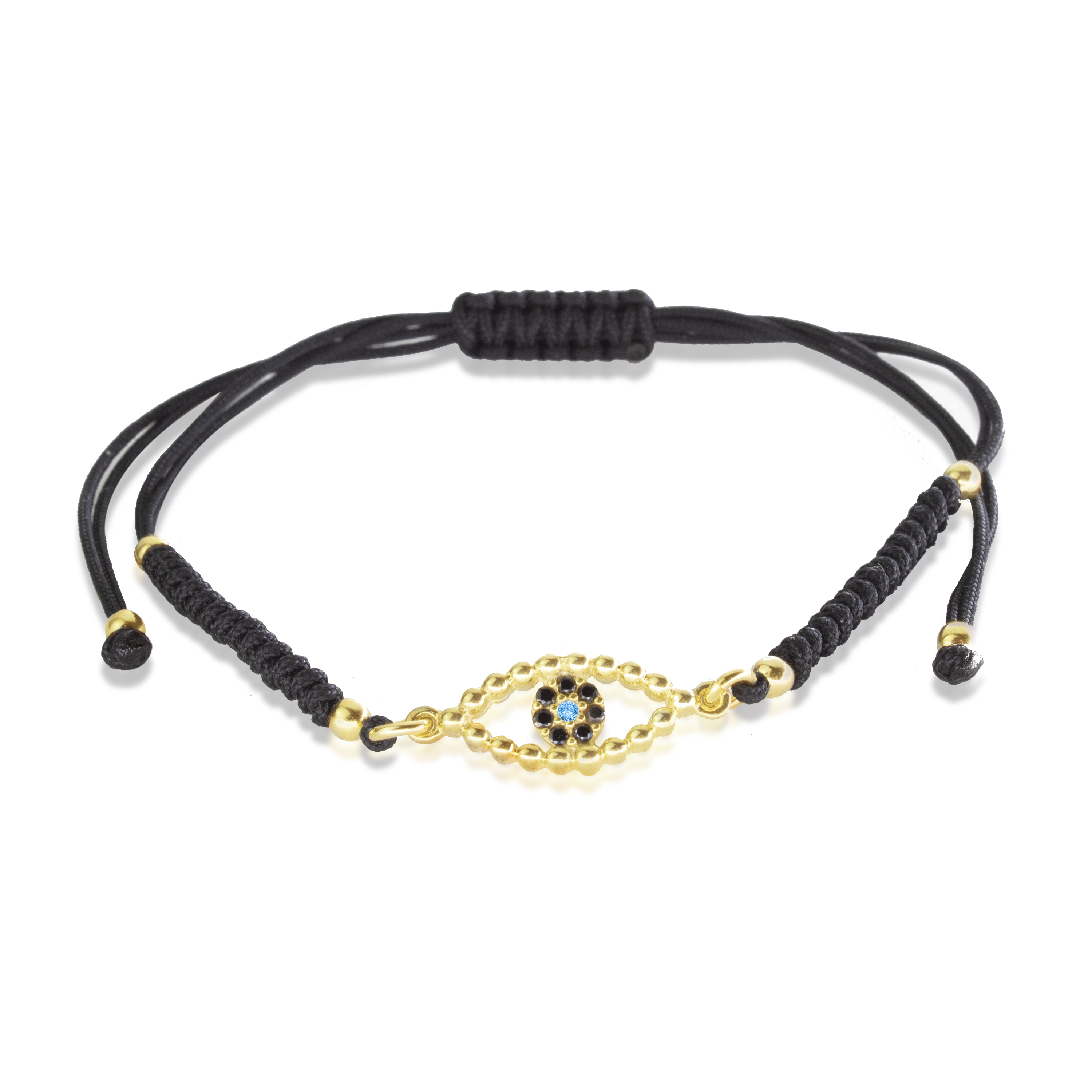 Evil Eye bracelet with black coloured cord made of gold plated sterling silver 925, decorated with black and light blue cubic zirconia.