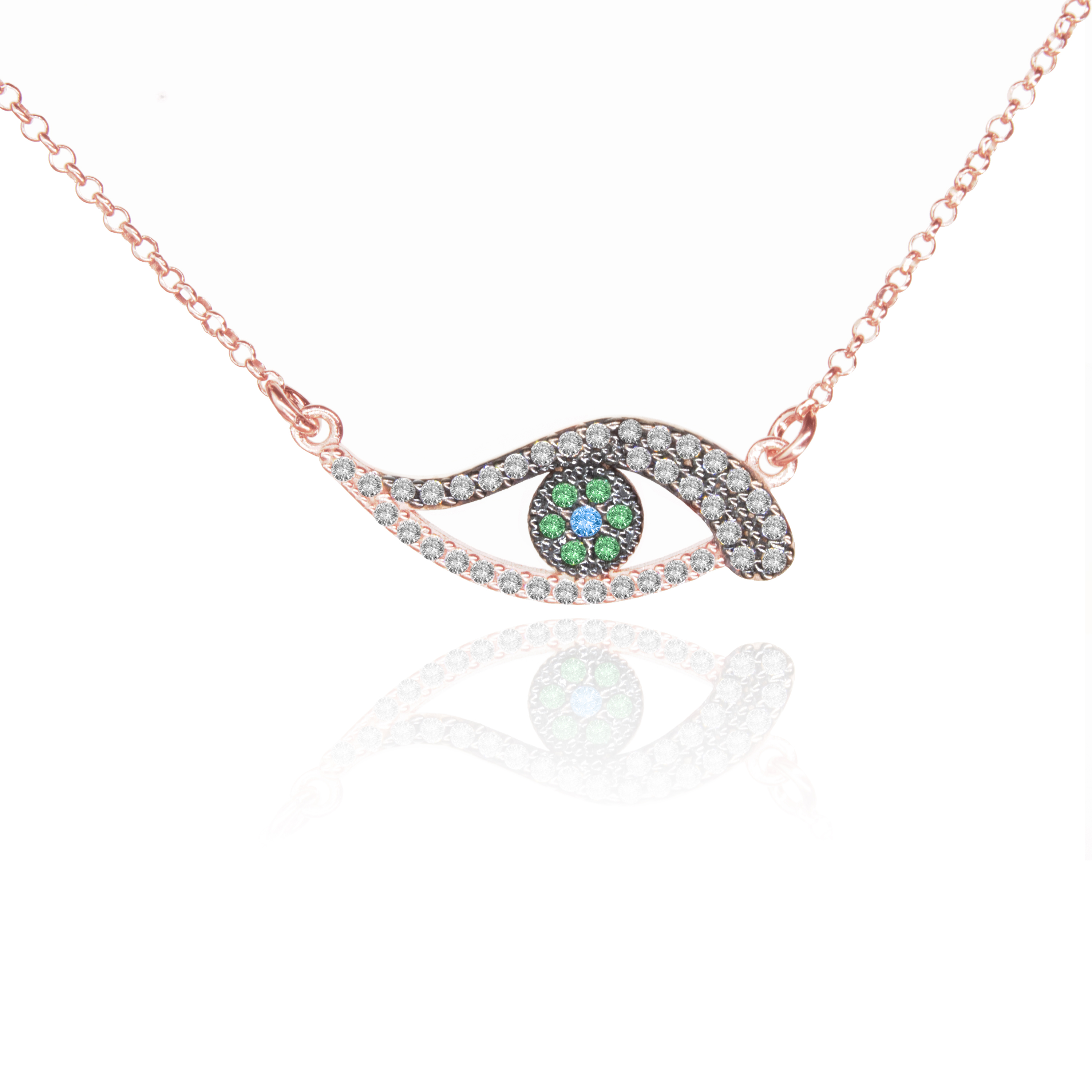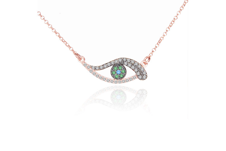 Evil Eye necklace made of rose plated sterling silver 925, decorated with white , light blue and green cubic zirconia.