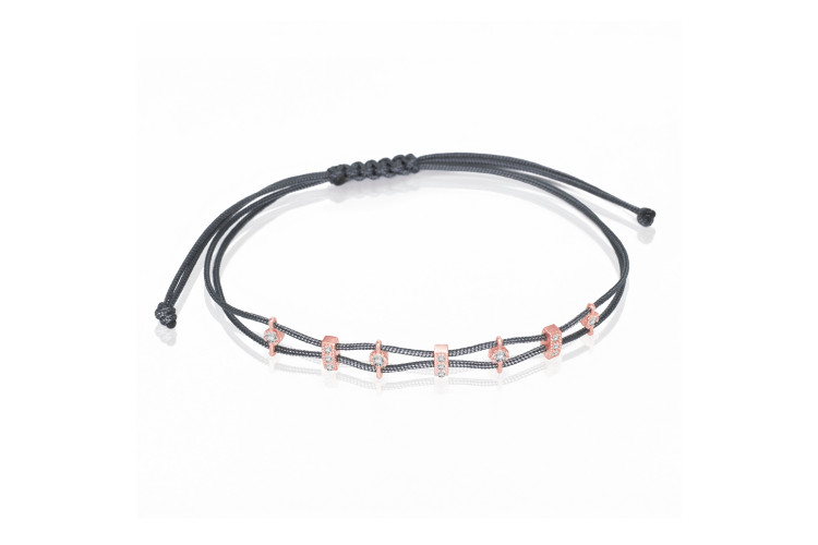 ELEGANT DOTS collection bracelet with grey coloured cord made of rose plated sterling silver 925, decorated with white cubic zirconia.